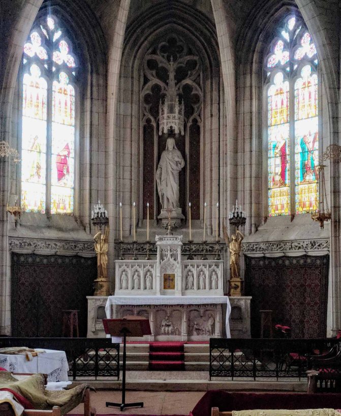 The original stained-glass windows were destroyed during bombings in 1940 and have been replaced. We loved the modern glass windows created by the french artist, Max Ingrand. He created dozens of stained glass windows throughout France and the world, including windows in the dome of the Washington Cathedral, in Washington D.C. and St. Dominic’s Church of San Francisco in the USA as well as the windows of the Saint-Etienne church of la Malbaie and Lac-au-Saumon, both in Quebec, Canada.