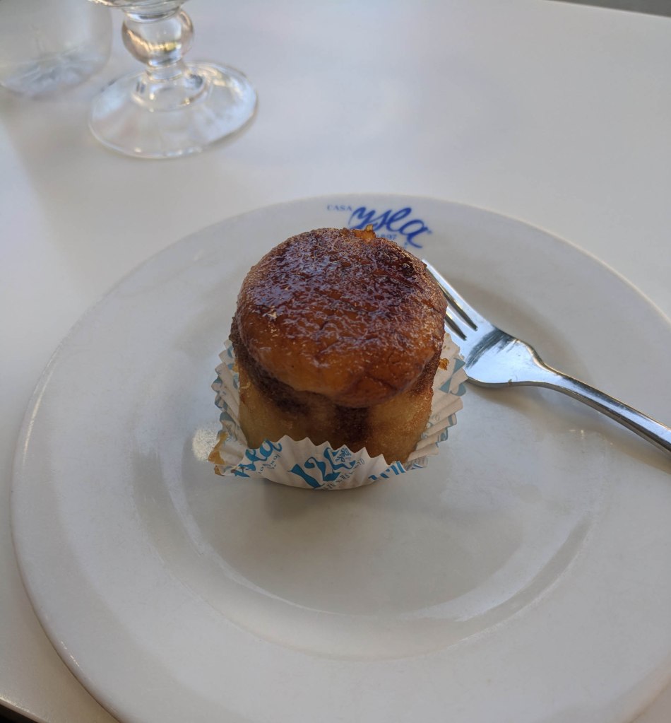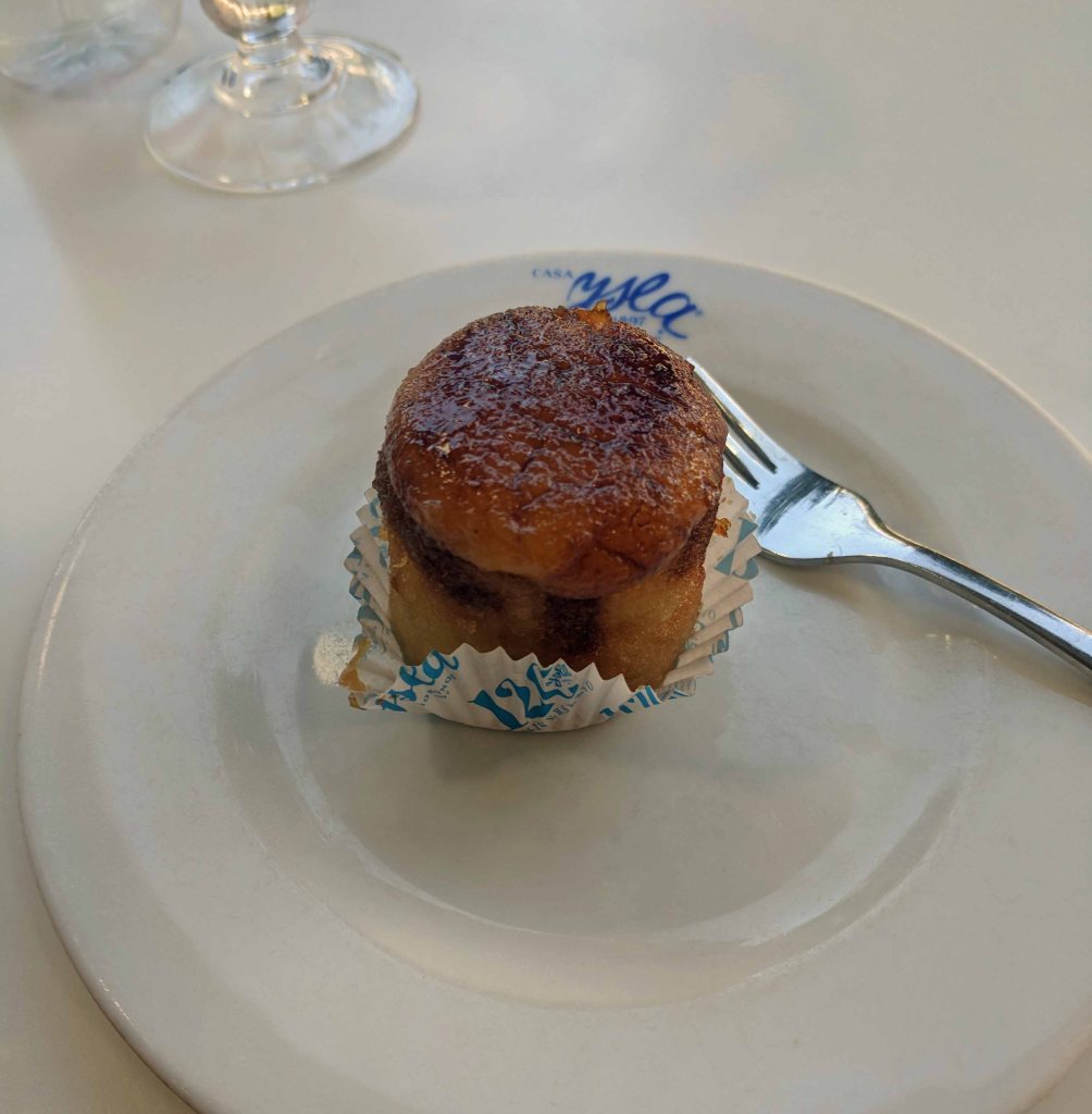 In Granada we learned of a local favorite dessert called a “pionono”. They are a small, 2-bite sized, soft and sweet, cake-like pastry. A thin layer of cake is rolled into a cylinder, drizzled with syrup and crowned with toasted cream. The toasted cream reminds us of the flavor of the toasted topping of a good crème brûlée. Delicious! Eat them right away; they don’t store well.