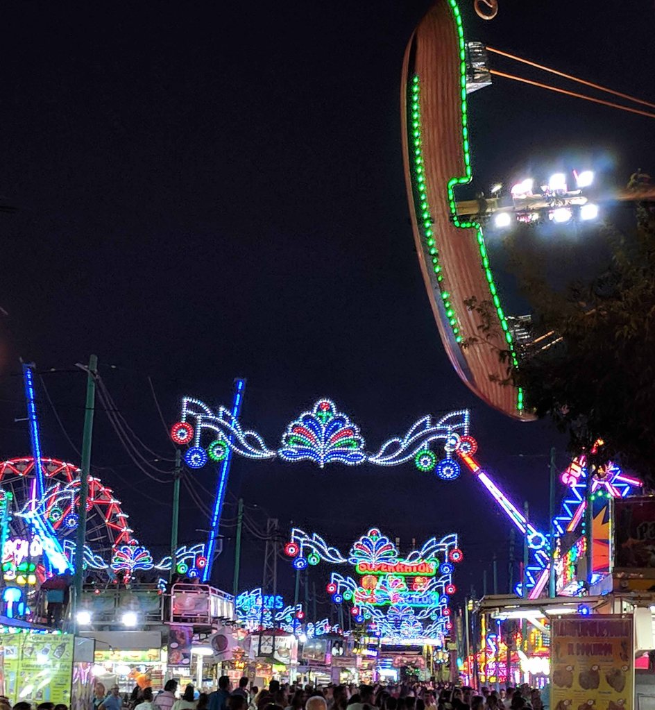 Once the Feria de Dia is over, everyone heads to the Feria de Noche, a quick shuttle bus ride west of the city, out to the fairgrounds where the carnival rides, candy floss and kebobs can be found. We spent a few hours wandering through the extensive midway with its numerous rides. There were so many options, children and young adults could be entertained for days.