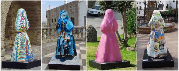 Strategically placed statues, called ‘El Cobijao – The Veiled women of Vejer’, caught our attention. We found a number of colorful and artistic representations of the veiled women. The original outfit worn included a long black skirt, a white blouse with a black sash and gathered together over that, a black cloak. The black cloak would be lifted up and used to cover the head and then the wearer would be completely covered except for one eye. Today the costume is worn during patron saint’s days. These beautiful veiled statues are another unique feature of Vejer.