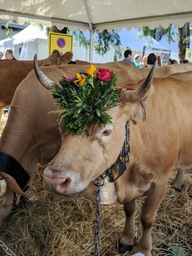 This charming and authentic festival acknowledges a past way of life and the origins of the area. Cows that have spent the summer months grazing pastures in the Alps were being driven down, and through the streets, to lower pastures ahead of winter. The cows heads were decorated with traditional colorful floral arrangements and large bells hung around their necks. There is an annual competition and we were able to see the beautiful cow that won the Golden Bell Award of Paris.