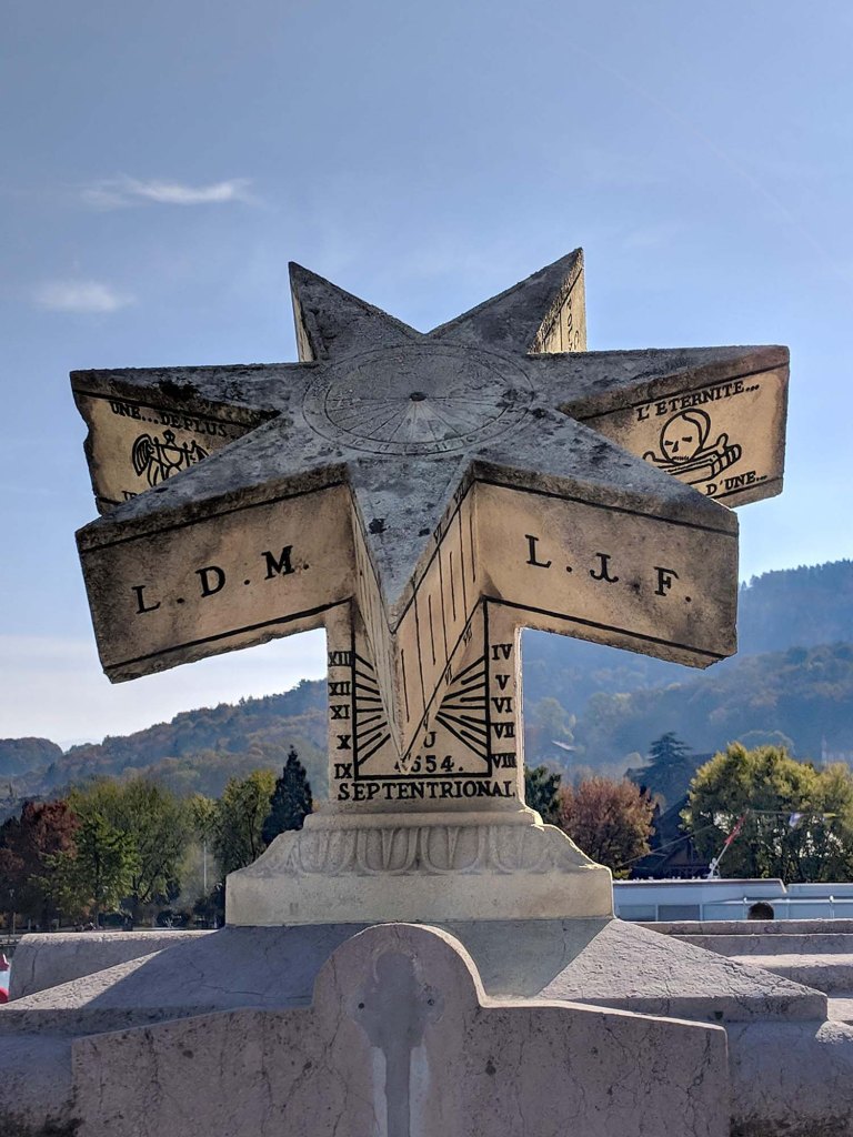 We found a fascinating sundial on our stroll along Lake Annecy. A local monk, Brother Arsène Jean-Marie Dumurgier (1808-1879)], in 1874 created an interestingly shaped 7-pointed sundial, called ‘gnomon polyorenoma’, to measure time. This sundial now graces the walk next to the lake.
