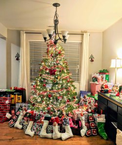 Our newly married couple chose to cut down their own Christmas tree this year and invited us along to visit a local Christmas tree farm. The perfect tree was selected, cut down and loaded in the back of the truck for the drive back to their home. Once standing in the living room everyone helped decorate it. What a fun holiday tradition.