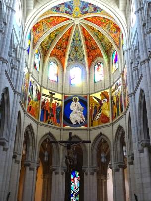 The most treasured possession is inside in the form of the Patroness of Madrid. The story is that in 1085 King Alfonso VI found an image of the Virgin inside a city wall in Madrid and named the devotional image Almudena (from the Arabic word almudaina, meaning city wall). We thought the unique ceilings and stained glass windows were striking.