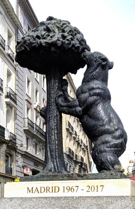 On the Eastern corner of the square is the beautiful and symbolic ‘El Oso y el Madroño’ (the Bear and the Strawberry Tree) statue, the symbol of Madrid. Once bears populated many of Madrid’s forests and a favorite food was found on the Arbutus Unedo, called Madroño tree in Spanish. It produced a tasty fruit that looked like strawberries, hence they were nicknamed “strawberry trees”. The city’s flag also uses this symbol surrounded by the seven stars known as Ursa Major (“larger bear” in Latin).