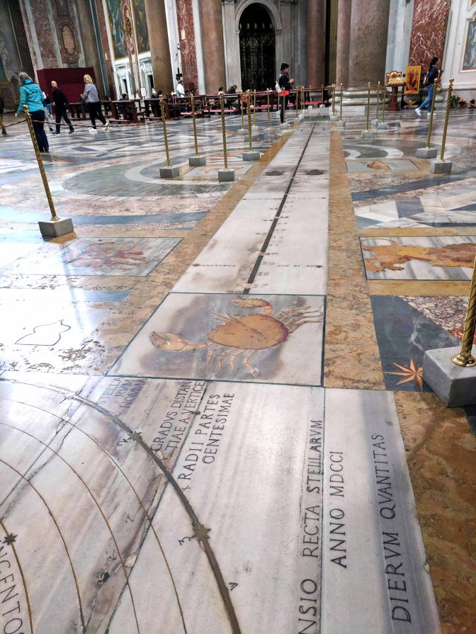 The interior also has one rare feature we had not encountered within a church. In 1702 a meridian line, a sort of sundial, was built diagonally across the floor inside the basilica and it is still operational. The bronze line is 45 meters long and set in a beautiful yellow-white marble.