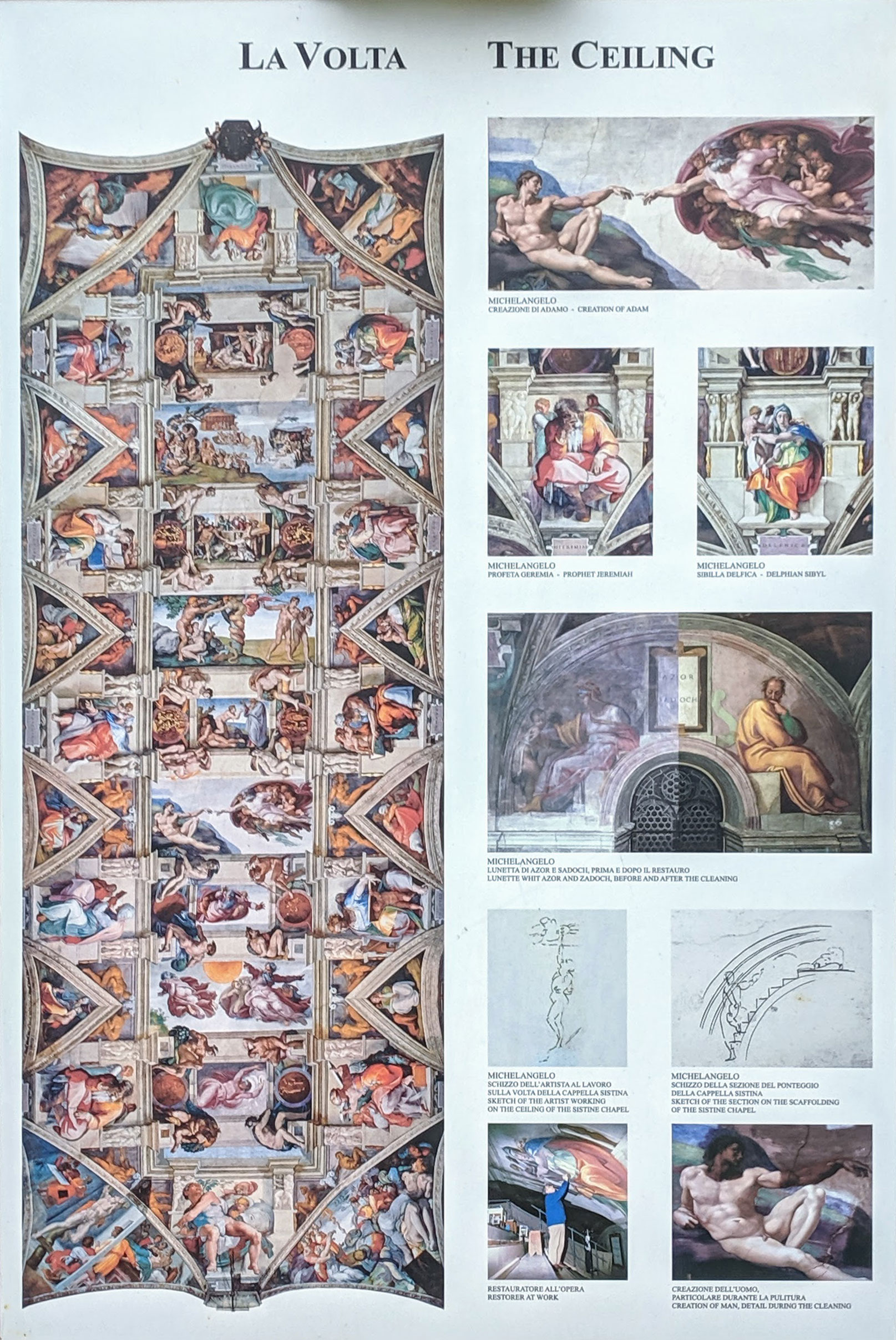 2) Michelangelo Buonarroti painted incredibly detailed and brightly colored frescoes into the ceiling with scenes from the Book of Genesis in the Old Testament telling the story of man. He was originally asked to paint only 12 figures, the Apostles. Michelangelo declined because he felt he was a sculptor, not a painter. However eventually the Pope convinced Michelangelo and gave him free reign to paint biblical scenes of his own choice. When the work was finished, Michelangelo had painted more than 300 figures.