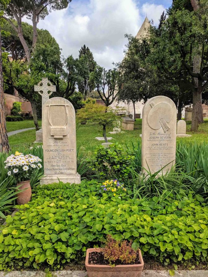 The English poets John Keats and Percy Shelley are both buried there as are their close friends Edward John Trelawney and Joseph Severn. Keats died in Rome in 1821 of tuberculosis at the age of 25 and Shelley drowned in a boating accident one year later. Keats did not wish his name to be on his headstone, so Keats’ headstone refers only to a “Young English Poet”. However, when Joseph Severn died in 1879 he wished to be buried next to his friend John Keats and Severn’s tombstone boldly claims he was a “devoted friend and deathbed companion of John Keats”.