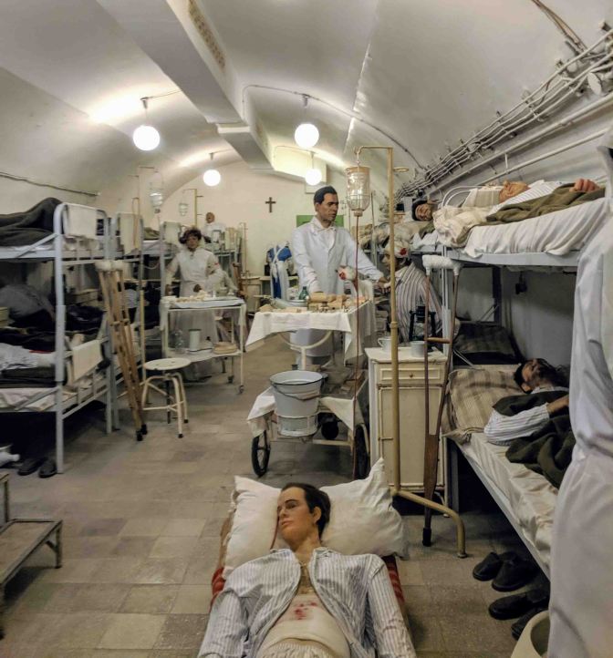 The Hospital in the Rock was designed to treat 60–70 patients, but at one point in 1944-45, during the Siege of Budapest, the hospital was aiding up to 600 wounded soldiers. Both civilians and soldiers were treated in the hospital with a separate ward for women. They have on record that 5 babies were born here below ground. The facility had its own generators, portable X-ray machines, 2 operating surgeries, 40+ doctors, was under the protection of the Red Cross and was fully supported by the nearby, above ground, St. John’s Hospital.