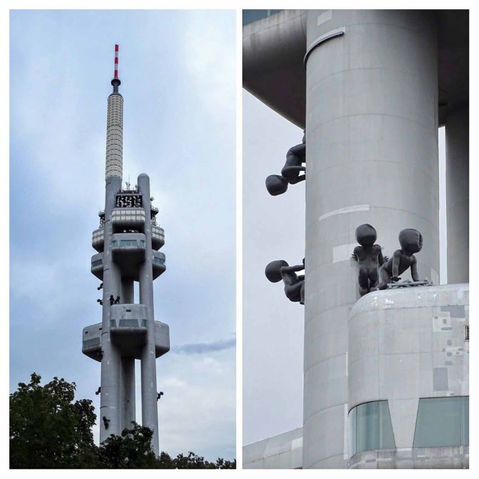 There are his giant baby creations. They are cute until you see the faces; they have bar codes instead of faces, leaving you feeling somewhat unsettled. There are 3 crawling in a park and 9 more climbing the huge Žižkov television tower.