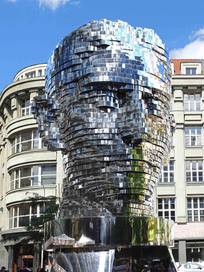 Then we found Metamorphosis next to the Quadrio business center in Prague (Metamorphosis had once been temporarily installed in Charlotte, North Carolina) In comparison to his other works, we found this one absolutely beautiful. The mesmerizing rotating mirrored sculpture, when aligned, is of the head and face of Prague’s renowned author, Franz Kafka and possibly named after the author’s most popular and best-selling short story, “The Metamorphosis,” that he wrote 1912.