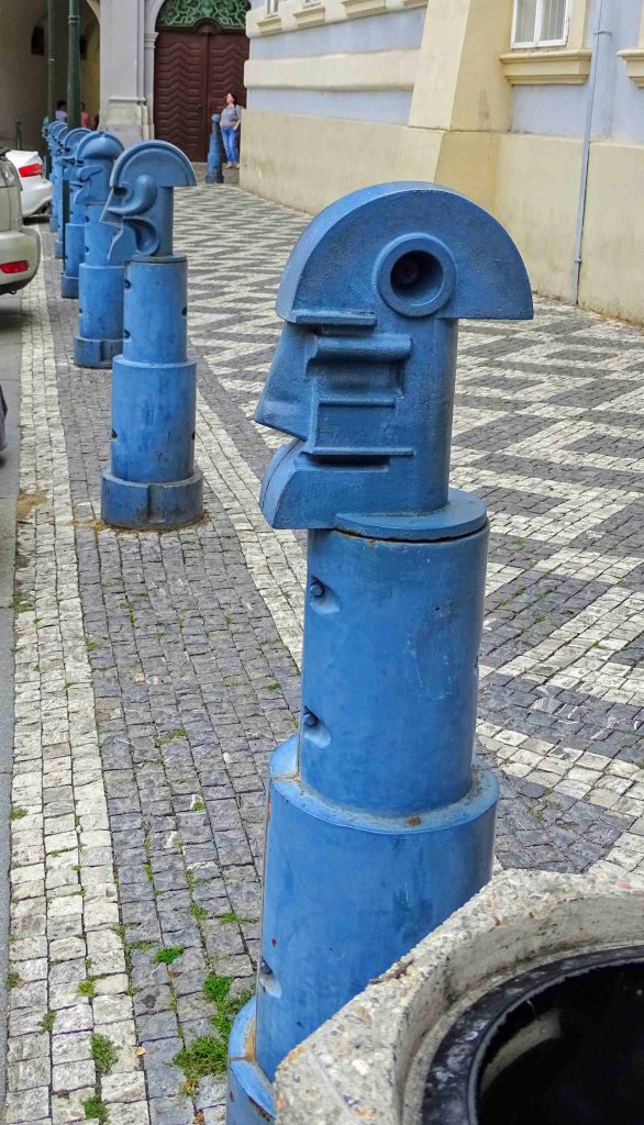 Of all the bollards in Prague these blue ones, created in 1993, placed in front of Liechtenstein Palace are the most unique. They represent the 27 Czech Protestant nobles that were executed in the Old Town Square on June 21, 1621 just like the white crosses in our “Ahoj z Prague” blog post.