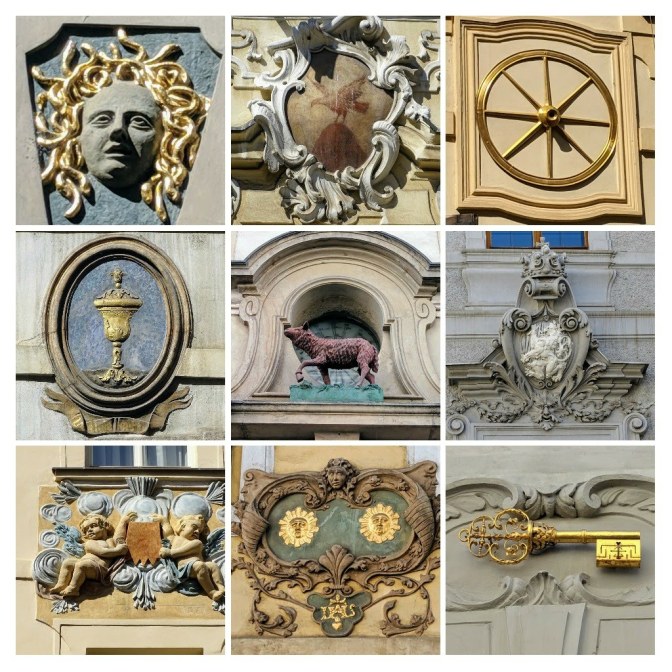 Usually the painted signs were placed above the doorway arches and we spotted an interesting variety of these bygone symbols during our strolls. We found the golden ring, the blue pony, the black sun, the golden wheel, the white peacock, the golden angel, the three fiddlers, stone lamb, two bears, red lion, two suns, white swan, golden tiger, blue grape, golden cup, red lamb and the golden key. The golden signs may have identified the house as having ties to alchemy as well.