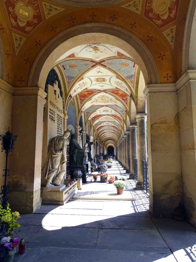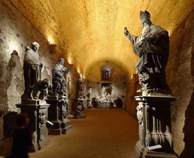 We continued meandering through the fortress grounds and found a rare rotunda of St. Martin, a tiny perfect chapel, all kinds of memorials and monuments and then we joined a Gorlice (Hall) tour of the casemates and tunnels beneath the fortress. First on the tour was a video capturing parts of the history of Vyšehrad and next we we guided through narrow underground corridors, that had once been used to rapidly move troops, and we ended up in a large underground hall where six original Baroque statue groups from Charles Bridge are stored and preserved. Our guide was an informative gal and was able to provide wonderful stories and details about the various statues.