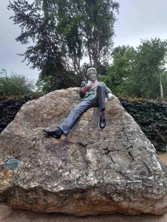Nearly 100 years after the death of another of Ireland’s famous sons, poet and playwright, Oscar Wilde, (1854-1900) a commemorative sculpture was unveiled in a park near his childhood home. At first glance the statue with it’s lop-sided grin, lounging on the rock is hard to take seriously, however the variety of stone materials thoughtfully sourced from around the world and the detailed sculpting is impressive. Wilde’s jacket is carved from green nephrite jade from British Columbia, Canada, the collar is pink thulite from Norway, the pant legs are blue pearl granite from Norway and the shoes are black charnockite from India tied with bronze shoelaces. His tie is made from glazed porcelain, his head from white jadeite and the large quartz boulder he is reclining on is from Dublin’s local Wicklow Mountains.