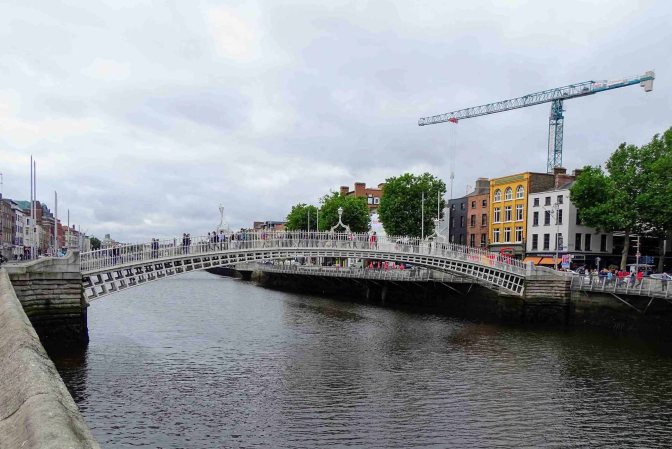 The Ha’penny Bridge, built in 1816 was originally called the Wellington Bridge until the name was officially changed to the Liffey Bridge. Today this pedestrian bridge is fondly called the Penny-Ha’penny Bridge or just Ha’penny because the cost of the toll for 100 years after in was built was a ha’penny. The toll was eventually increased to a penny-ha’penny (1½ pence), but the toll was finally eliminated in 1919. The Bridge was built of cast iron, painted bright white and is 140 feet long (43 km) by 12 feet wide (3.66 m).