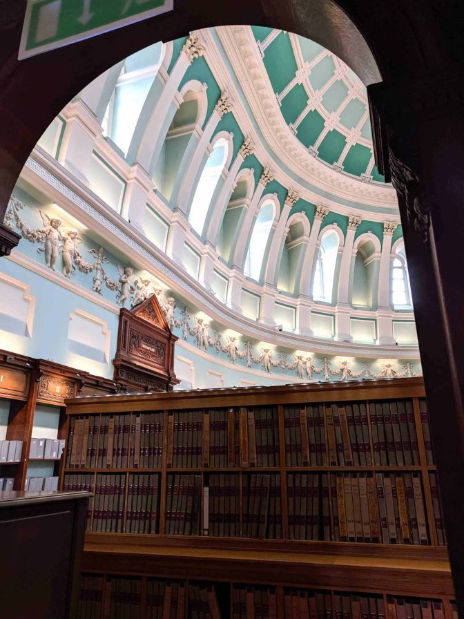 The magnificent musty old-book-smell in the Long Room at Trinity College’s Old Library, built 1712-32, houses 200,000 of the libraries rarest, neatly shelved books by size. The smallest and lightest books are shelved at the top and accessible only by tall ladders with the larger and heavier books lined along the bottom shelves. In total, Trinity College Library has 3,000,000 books spread between 8 buildings.