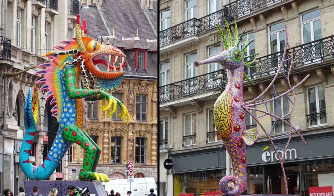 Lille had wonderful Mexican art sculptures called Eldorado installed all along both sides of one it’s streets in front of Lille-Flandres train station. We noticed 10 brightly colored 20-foot tall (6 meters) wooden sculptures called “alebrijes”, which are Mexican folk art fantastical creatures. This open-air street museum will host these temporary sculptures until December this year. We had seen hand sized alebrijes during our visits to Mexico but these giants were outstanding.