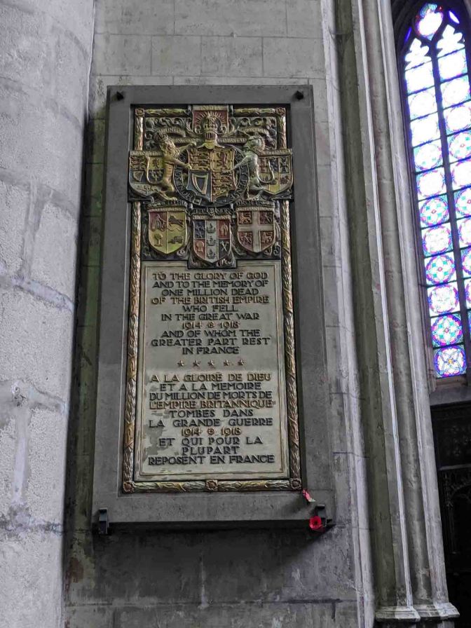 The church has been bombed three times, in 1914, 1916 and 1942 and as a result several stain glass windows have been replaced. The new beautiful replacement windows can be seen in the photo link below. The Saint-Maurice church has two organs: A large organ, built in 1877 and a choir organ, built in 1882. We are humbled each time we see (in a number of France’s churches) beautiful plaques acknowledging and commemorating the British Empire’s one million soldiers that lost their lives in France in World War I.