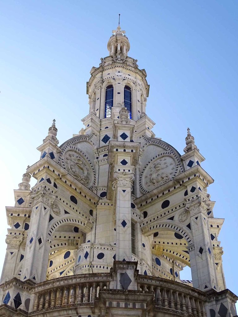 The elaborate roof line, from a distance was wonderful, reminding us of a cityscape and up close the artistic details and decorations were outstanding. Originally designed as a hunting lodge, the château has an unbelievable 440 rooms, 282 fireplaces and 84 staircases. The personal emblem of King Francis I was the salamander and we saw many carvings of this charming creature throughout the château.