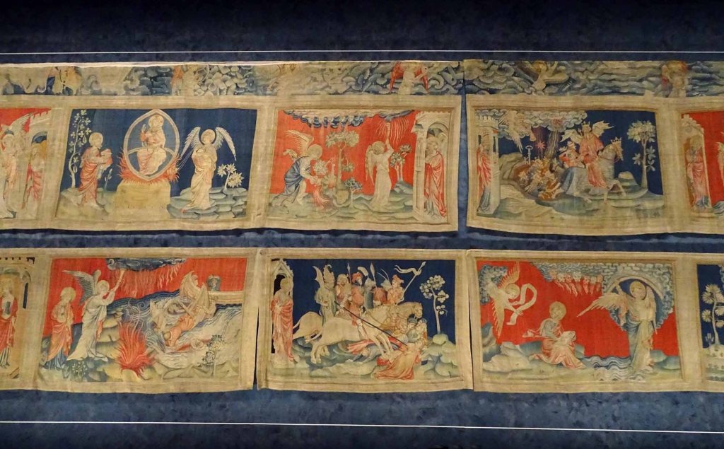 When we heard there was another very old tapestry called the Apocalypse Tapestry that was on display in the Château d’Angers we knew we wanted to see it as well. The Apocalypse Tapestry is actually a large set of tapestries that was commissioned by Louis I, the Duke of Anjou, and created between 1377 and 1382. There were originally six sections, each 78-foot (24 m) wide by 20-foot (6.1 m) high, comprising 90 different scenes. During the French revolution many medieval tapestries were completely destroyed so it is lucky that at least 71 of the original 90 scenes survive today. The tapestries depict the story of the Apocalypse from the Book of Revelation. We feel truly blessed to have seen and experienced these priceless artifacts.