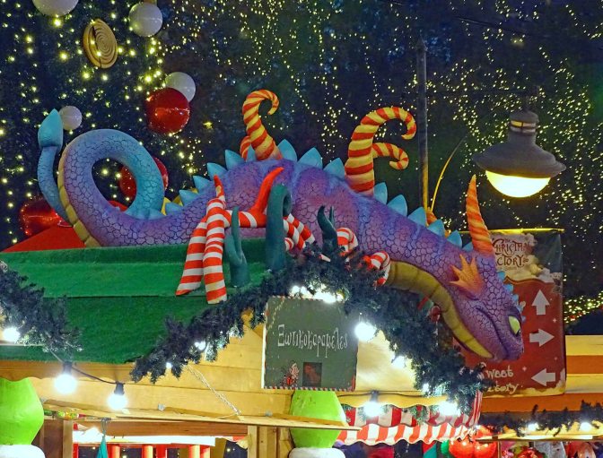 We visited the Christmas Factory at Technopolis and found a handful of bazaars selling handicrafts and gifts. There were carnival rides available for the children, an opportunity to visit Santa and a friendly purple dragon watching over the park. We found a wonderful sesame seed, honey + peanut brittle, called pasteli, that we couldn’t find as good anywhere else and were tempted to pay the admission fee a second time just to buy more brittle.