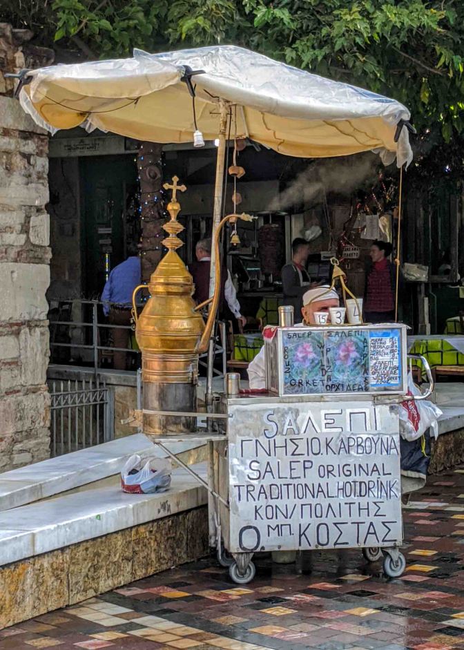 Salepi – In years past Salepi venders would call out: “Salepi, salepi, hot salepi” but the ones we saw were standing quietly next to their wheeled cart that had a large, hot, brass samovar sitting on top of it. The samovar was filled with a pleasantly soothing, off-white drink. Traditionally made from the dried root of the pink butterfly orchid plant, milk and sugar then sprinkled with cinnamon and ground ginger, a cup of thick(ish) salepi was perhaps our favorite hot drink to enjoy in Athens on a cold winter’s night.