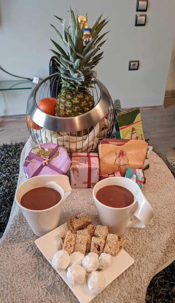 We ended up using the flyer pages as our gift wrap, ‘paper ribbon’ and cutting out tiny decorations found in the flyer as decorations and labels for our packages. A pineapple became our Christmas tree and a crystal necklace became the garland. Two chocolate teddy bears acted as the tree topper. Hot chocolates accompany the plate of pasteli and white kourabiedes.