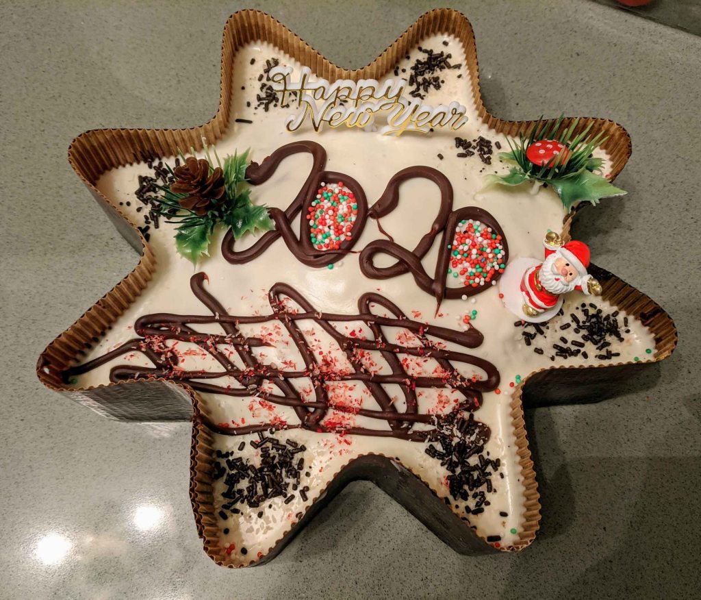 Orthodox Christians recognize St. Basil’s Day and January 1st. A cake called ‘Vasilopita’ is a simple vanilla cake, usually spiced with orange, sometimes mastika, and sprinkled with powdered sugar and baked with a coin cooked inside for the big New Year’s Eve dinner. Whoever finds the coin in their slice will have good luck during the coming year. Yay – we found one!