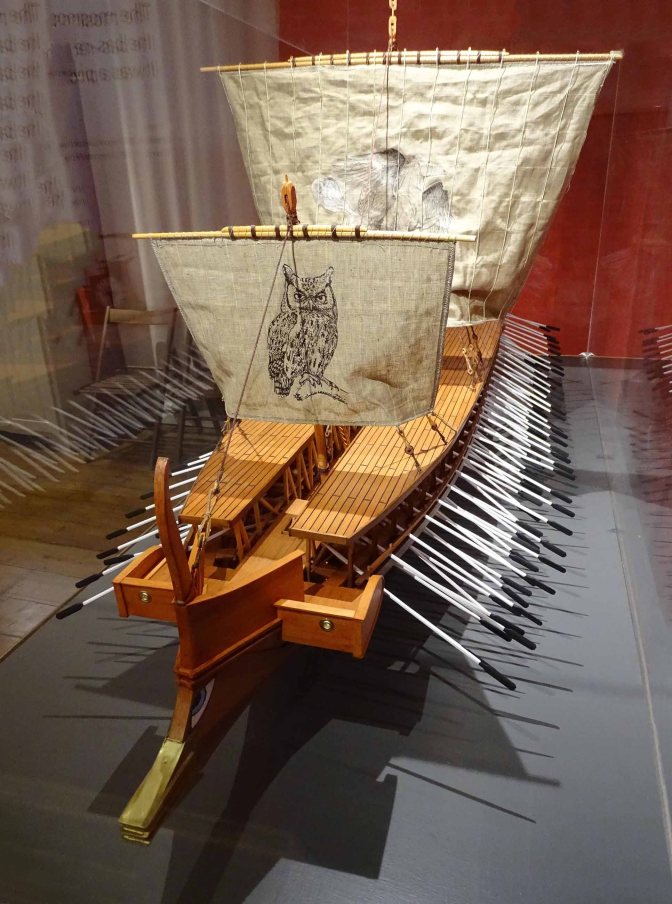 What a surprise this museum held and it was steps away from our apartment. We saw models and graphic representations of the most important and impressive warship of Greek antiquity, called the trireme. The trireme was a warship made up of three levels of oars, manned with one man per oar. We were thrilled to find a fill-sized trireme moored at a marina we visited a few days later.