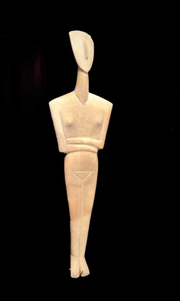 This museum houses one of the most complete private collections of Cycladic Art worldwide. We saw a number of the famous, almost translucent white marble female figurines as well as vases, tools, weapons and pottery from the distinctive Cycladic culture (3300 – 2000 BCE). The female figurines typically have their arms folded across their body and although they are striking in white, we learned the artists would have typically painted them.