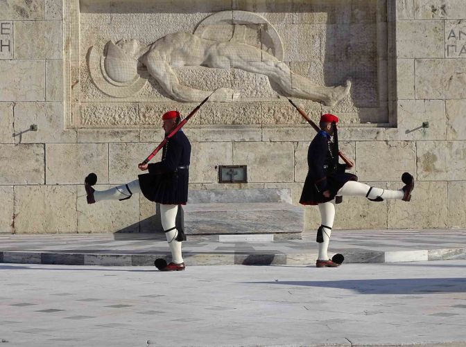 The Presidential Guard is a ceremonial infantry unit that is classified as the last unit of Evzones in the Hellenic Army. The Evzones have become symbols of bravery and courage for the Greek people. Every soldier guards for one hour, 3 times in total every 48 hours. Throughout these 60 minutes, they must stand in perfect stillness until it is time to switch with another guard. Perfect stillness means the soldiers must not make any face or eye movements which includes no blinking. During the changing of the guard, they work in pairs so they can perfectly coordinate their moves. The steps required during the change are carried out in incredibly slow motion, as a precaution of the soldiers blood circulation after 60 minutes of complete immobility. And it’s great for taking pictures 🙂