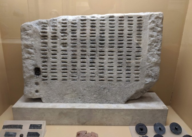 Kleroteria were allotment machines made from slabs of wood or stone that stood at the entrance to every court in the 5th to 2nd centuries BCE. Carved into the face of each slab were columns of narrow slots aligned in horizontal rows. Into the slots were inserted the bronze tickets (pinakia) carried by citizens who were eligible for jury service. The pinakia would be engraved with the citizen’s name, his township and his father’s name. On the left side of the machine there was a metal tube at the top where a number of black or white bronze balls would be poured into the tube in random order. Turning a crank would release the balls one by one and depending on whether a white or a black ball emerged, citizens represented by the entire horizontal row of pinakia were accepted or rejected for jury service that day.