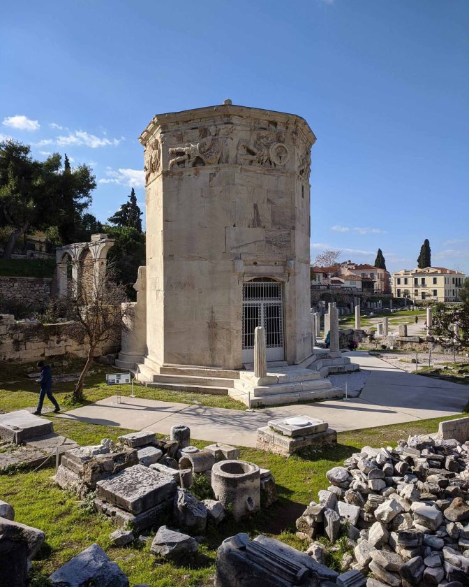 At the ruins of the Roman Agora our favorite site was an ancient 39 foot (12 meter) high octagonal tower with the wonderful name ‘Tower of the Winds’. It was designed by an astronomer in the 1st century BCE and served as a weather vane, water clock, compass and sundial. On each side of the octagon there are carved reliefs of figures floating on air representing a compass direction; in ancient Greece they were called the 8 winds. The ancient Greek philosopher Aristotle, referred to them as: Aparctias (N), Caecias (NE), Apeliotes (E), Eurus (SE), Notos (S), Lips (SW), Zephyrus and Argestes (NW).