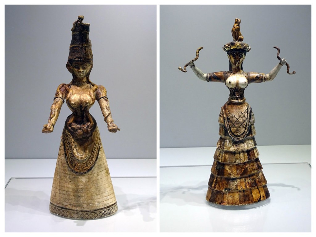 We saw bronze tools and weapons and decorated bathtub shaped burial vessels. There were tablets, vases and cups inscribed in Linear A, an as yet, undeciphered language. The inscribed pieces have been found in numerous sites in both Crete as well as a few other Aegean islands. The infamous Phaistos Disc covered with inscriptions, that have also eluded attempts at deciphering, was here, as well as these two fine 3600 year old snake goddess figurines.
