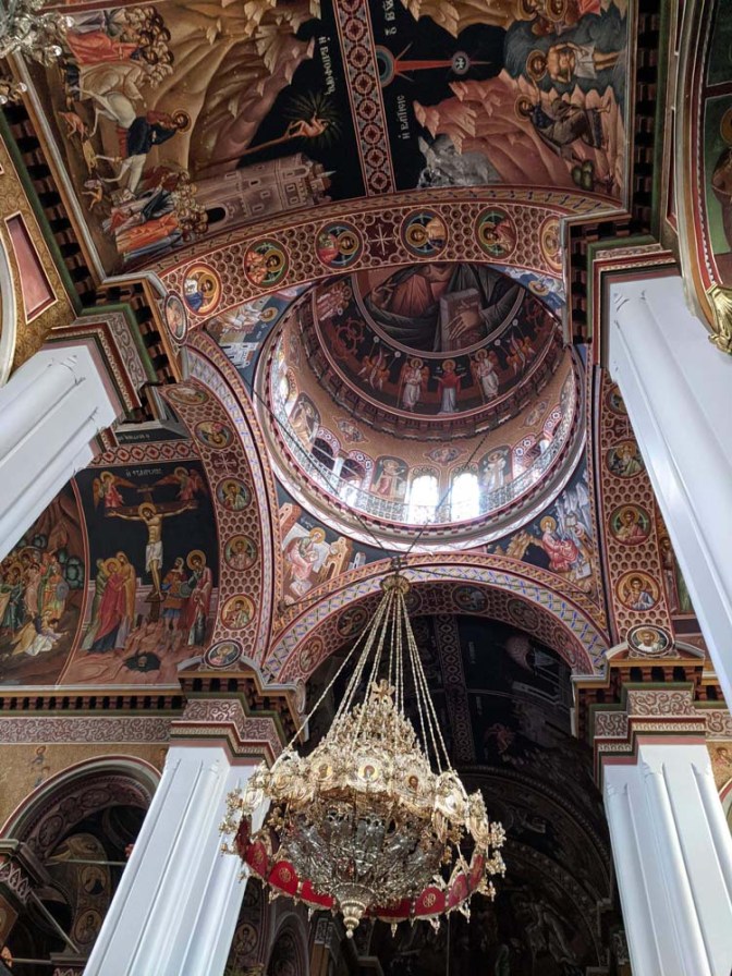 Saint Minas is truly a beautiful cathedral. Most Greek churches we visited have vibrantly painted scenes on the ceilings and walls and this cathedral was a sensational example.