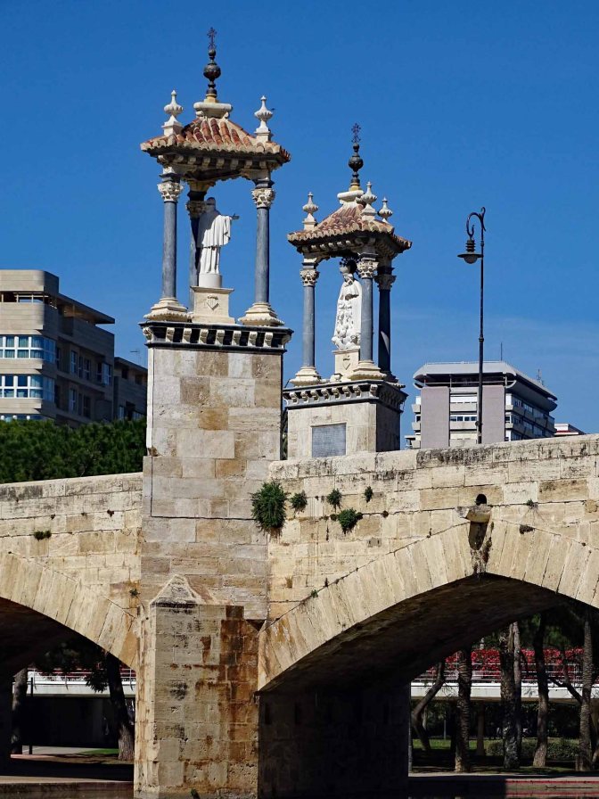 Two years ago in one of our very early postings called Jardins del Reial, we mentioned the Turia Gardens. To this day it is one of our favorite places to walk, the gardens wrap around much of the old town and are one of the larger urban parks in the country. Once upon a time it was the Turia River but the river was diverted to prevent the continual flooding of the city and in the 1980’s landscapers redesigned the flat unattractive riverbed into 5.5 miles (9 km) of beckoning gardens, convenient foot paths, separate bicycle paths, leisure and sports areas, ponds, children’s playgrounds and romantic spots to unwind. The scenery is ever changing and the 18 bridges, some built as early as the 15th century, that cross over the former river offer wonderful vignettes to photograph and stroll beneath.