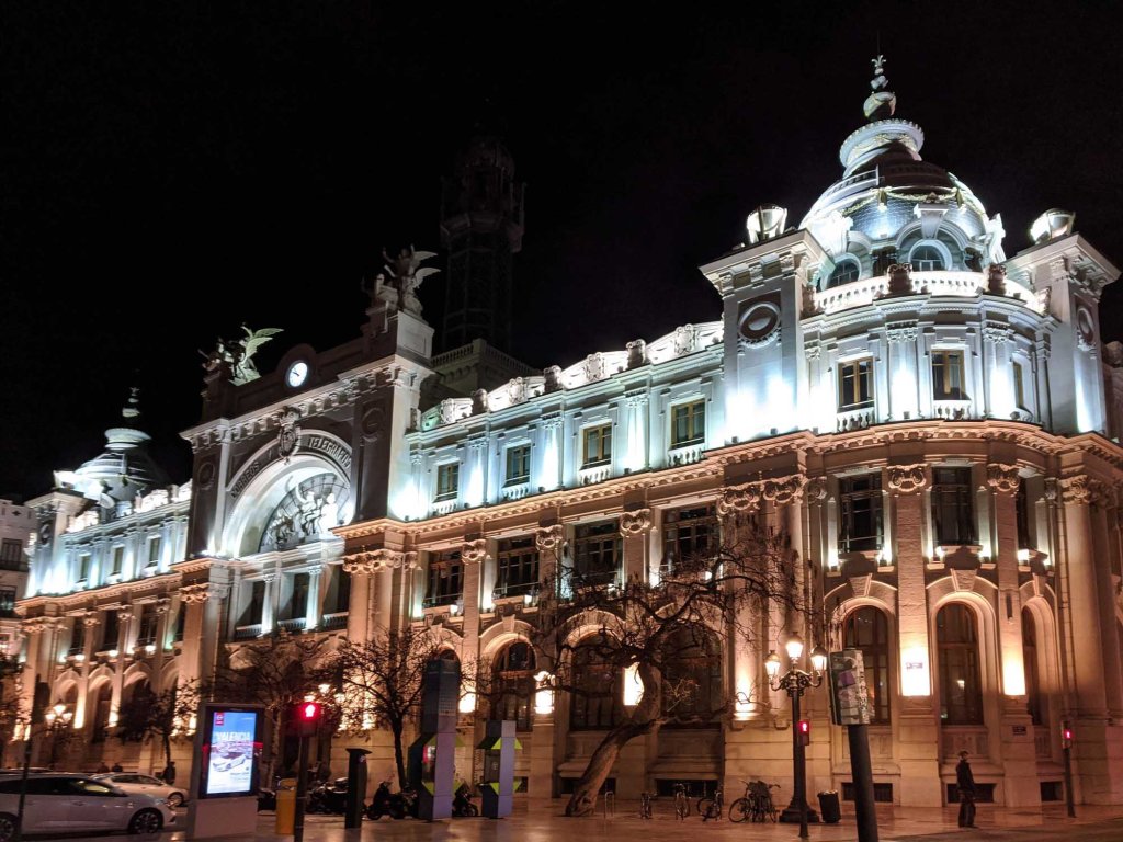Valencia’s Edificio de Correos (Post Office) at night