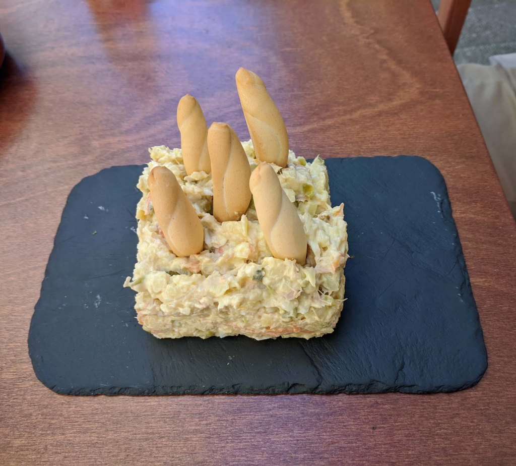 One of the most common dishes found in any Spanish tapas bar is, ensaladilla rusa. A Russian chef is credited with inventing this version of a potato salad. In Spain, the recipe generally includes potatoes, peas, carrots, tuna and mixed with a garlic aioli. We have been served this many times and every bar, cafe or restaurant adds their own spin to it. We have had it with shrimp, hard boiled egg or green grapes added in. Crunchy little bread sticks, the size of your little finger, called picos, are often served with ensaladilla rusa.