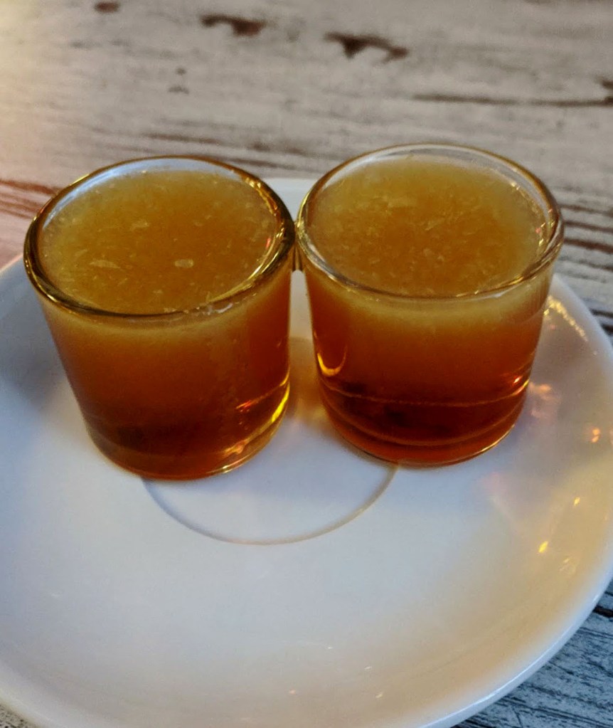At the end of your meal, when dining out, waiters often offer a complimentary after dinner drink. A new one for us was Ronmiel topped with freshly squeezed lemon juice. Ronmiel is a rum and honey liqueur, made in the Canary Islands. The fresh lemon floating on top added a perfectly tart accompaniment to the sweet liqueur.