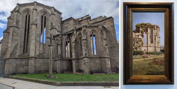 The Santo Domingo Convent was founded in 1282 and was used for more than half a millennium. But in 1836 the Spanish government passed a law, generally referred to as The Madoz law, whereby the government seized and sold properties belonging to citizens, businesses and to the catholic church. In Pontevedra the convent was forcibly closed and the land was granted to the city. Part of the Convent’s property was used to create gardens in the Alameda where the Town Hall was built. Additionally one chapel was demolished, a tower was torn down and some of the deteriorating materials were used to pave the streets. The evocative ruins, including the main apse, part of a wall where a rose window is preserved and an entrance to the convent, were saved from demolition in 1895 and are now a protected National Monument. The photo combination below is how the ruins look in 2020 and what they looked like according to the artist’s painting, in 1902.
