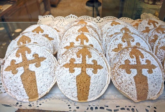 Santiago Cake is a delicious, ubiquitous, gluten free, speciality in Santiago de Compostela. It is made with ground almonds, sugar, eggs and sometimes brandy. Powdered sugar is sifted on top of the cake showing the pattern of the cross of St James. It was the ideal accompaniment to our morning café con leche or our afternoon cortado.