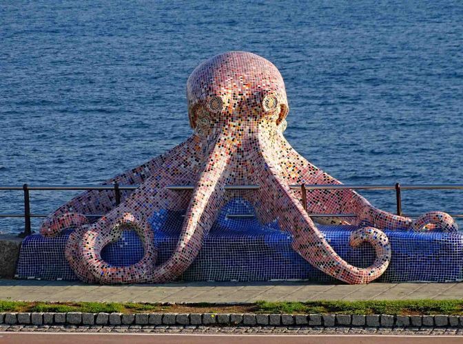 Along the pathway, paying homage to the region’s signature dish, the beloved pulpo a la gallega, we found this giant mosaic sculpture of an octopus resting on a fence, with its back to the glorious views of the north atlantic ocean.