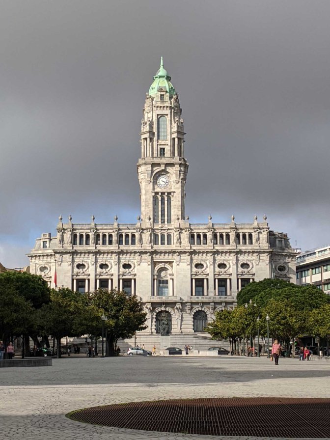 Porto’s town hall, Câmara Municipal, built in the early to mid 20th century, dominates the north end of Avenida dos Aliados. (pictured above in the paragraph about António Salazar) The building has 6 stories and the clock tower is 230 feet (70 m) high. The oldest building on the square is the former Palácio das Cardosas, now a 5-star InterContinental hotel, and it anchors the entire south side of the square, opposite City Hall. Flanking the east and west side of the oblong plaza are wonderfully ornate, massive commercial buildings built in various architectural styles. Many of the buildings are banks but our favorite was the “A Nacional” insurance company building with its incredible details.