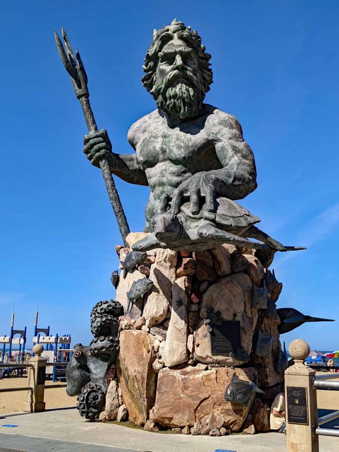 Midway along the boardwalk it would be difficult to miss the massive 34-foot-tall (10 m), 12.5 ton statue of Neptune, the Roman god of the Seas. He not only provided inspiration for the city’s nickname, “Neptune City” but also for the annual fall Neptune Festival that celebrates the history of Virginia Beach.
