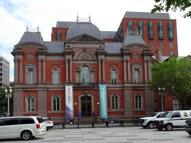 There were so many interesting installations at the Renwick. One couldn’t help but stop and gaze up at Leo Villareal’s enormous LED chandelier hanging above the staircase. Another room had a beautiful Dale Chihuly (1941) Seafoam and Amber-Tipped Chandelier hanging. There was a stunning set of gates made of brass, bronze, copper and steel created by Albert Paley (1944). Named one of “Five Pieces at Smithsonian Museums and Galleries You Shouldn’t Miss” is Kim Schmahmann’s (1955) Bureau of Bureaucracy, a magnificently crafted “wooden cabinet full of cupboards to nowhere, bottomless drawers, drawers within drawers, hidden compartments”. An amusing metaphor on both the image and inner workings of government. Photos are below in the Renwick Gallery link.