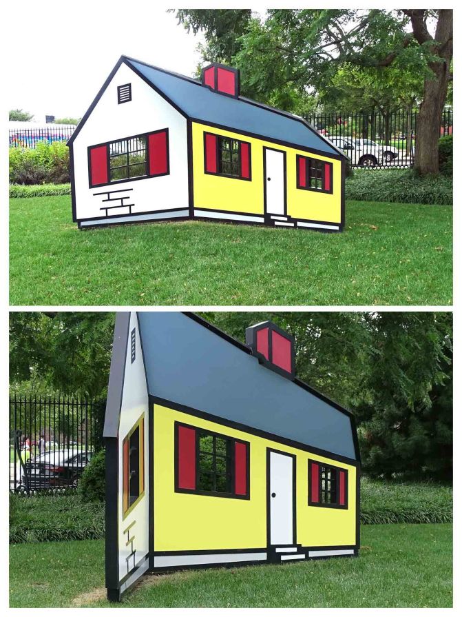 Roy Lichtenstein (1923-1997) is best remembered as an American comic book style, pop artist. Perhaps less known are the sculptures he created. His two dimensional house sculpture visually changed as you circled it.
