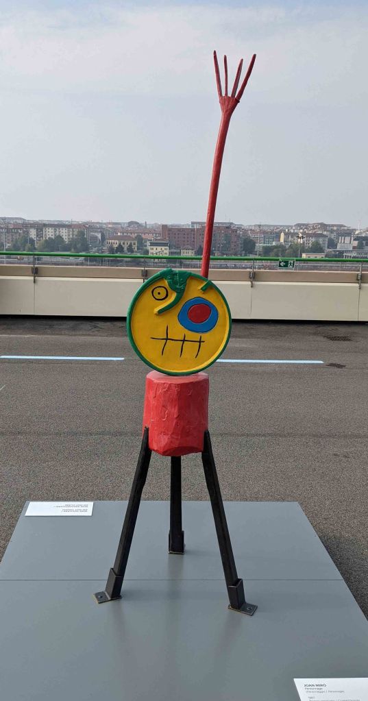 Located on the roof of the city’s former headquarters of Fiat, is the Pinacoteca Giovanni e Marella Agnelli art gallery. This unique space has a test track on the roof that each fiat vehicle would drive as it exited the assembly line and a blue glass globe convention center raised 111 feet (34 meters) above the test track that is visible for miles. There were sculptures by Joan Miró, the Spanish painter and sculptor, next to the test track and this one made us smile and wonder, did he get hit by a fiat? 😄