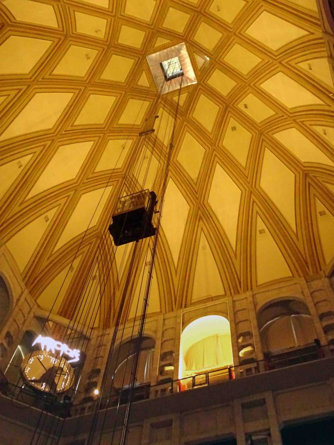 In the center of the museum is a glass elevator that ascends up 250 feet (75 m), through what looks like far too small an opening in the tower ceiling. It stops at an outside balcony and the 360 degree panoramic views of the city make it absolutely worth the ride.
