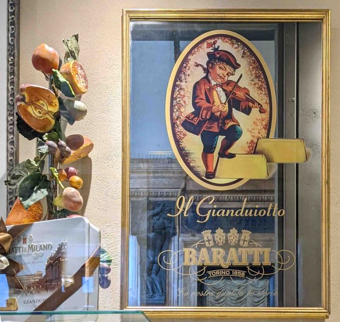 Turin is also the Italian capital of chocolate. In 1826 a chocolatier, named Caffarel, invented a confection he called Gianduja, after a favorite Piemonte carnivale character. Gianduja is a hazelnut and chocolate combination and is better known as Nutella throughout the world. The story is that during the Napoleonic wars, Turin had difficulty getting enough cocoa beans to create its rich chocolates, so hazelnut paste was added to the chocolate and the rest is history. The original gianduja recipe can still be found in shops everywhere in this city. (without the additives that Nutella uses)